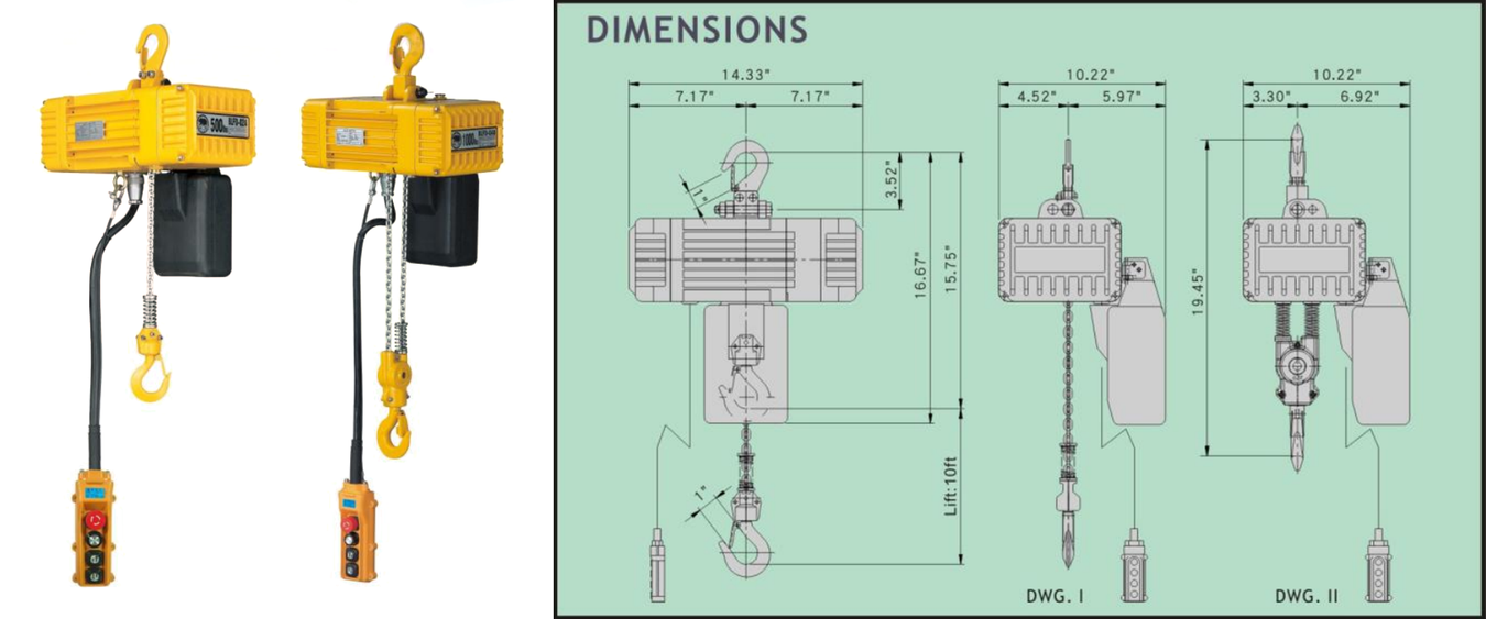 | MPN | Capacity (LBS) | Chain Fall | Main Voltage | 2 Speed Hoist Lift (FPM) | 10 Ft. N.W/G.W (Lbs) | Chain Add Per Feet of Lift | Cable Add Per Feet | Price | Quantity | |